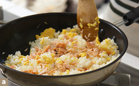 (1)の塩鮭を加えてごはんがパラパラになるまで炒める(写真a)。万能ねぎを加えて鍋肌からしょうゆを入れて手早く合わせ、塩、こしょうで味を調える。