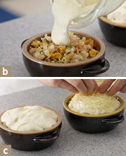 耐熱容器に(4)のチャーハンを入れ、(5)の温かいレンジホワイトソースをかける(写真b)。チーズをのせ(写真c)、230℃のオーブンで約15分焼く。