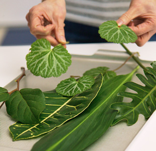 ウッドデッキの端を縁取るように造ったわが家の小さな庭。この季節、花はハーブのほかにサルスベリやハスなど種類が減ってくる代わりに、さまざまな草木の葉の緑が目を楽しませてくれます。アジサイの低木を分け入っていくと大きい葉の陰に小ぶりのハランやユキノシタが見つかるので、風通しを兼ねてちょっと刈り込み、きれいに洗ってキッチンへ。いっしょに並べた南国らしい葉っぱは撮影用に花屋さんで買ったものです。こうして手に取って眺めていると、小さな葉で前菜を並べた焼き締めの器をふわっとおおうとか、冷たいデザートをのせた白いソーサーに重ねるとか。大きな葉はランチョンマットのように敷くとか、次々に盛り付けのアイデアが浮かんできます。使わない分は新聞紙で包んで水を含ませ、ポリ袋に入れて冷蔵庫に入れておけば、厚手のしっかりした葉っぱほどかなり日持ちします。