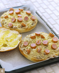 クッキングペーパーを敷いた天板にパンを並べる。下2枚分のパンに(5)のチキンクリームをのせ、とろけるチーズをちらしてウィンナをのせる。おまけのガーリックトーストは残ったパンの皮目を裏返し、にんにくのすりおろし少々(分量外)を塗り、オリーブ油大さじ1(分量外)を回しかける(写真c)。