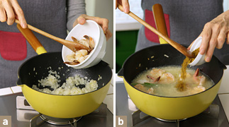 スープを加え、水気を軽く絞ったなす、レモングラスと香菜の軸部分を入れ、煮立ったらカレーフレークを加えて溶かす(写真b)。