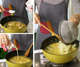 煮立ったらヨーグルト、生クリームを加え(写真c・d)、再び煮立ったらカリフラワーを入れてなじませ(写真e)、味をみて塩で調える。