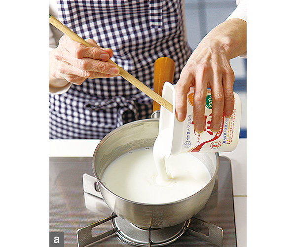 - 2. 鍋に牛乳とグラニュー糖を入れて火にかける。軽く温め、グラニュー糖が溶けたら火を止めてヨーグルト(写真a)、レモン汁を順に加えて混ぜる。