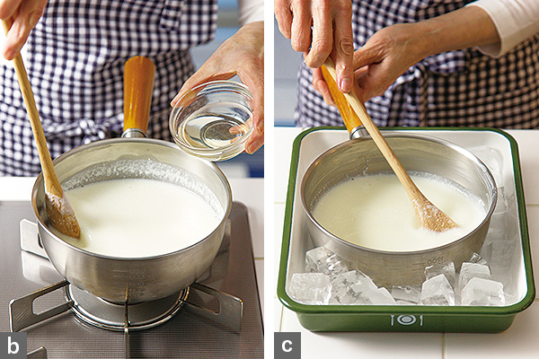 - 4. (2)に(3)を残さず加えて混ぜ(写真b)、鍋ごと氷水をあてて軽くとろみがつくまでゴムベラで混ぜる(写真c)。容器に流し、冷蔵庫で冷やし固める。