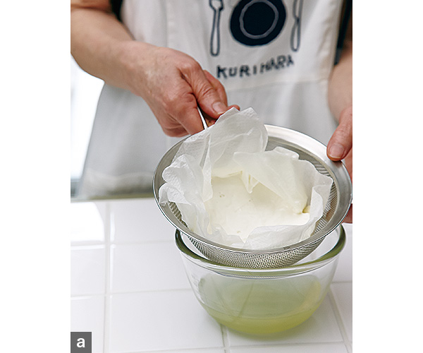 - 1. ボウルにざるを重ねてペーパータオルを敷き、ヨーグルトを入れる。ラップをして冷蔵庫に入れ、2~3時間以上おいて水気をしっかりと切る(写真a)。急ぐときは途中でペーパーを変えるとよい。