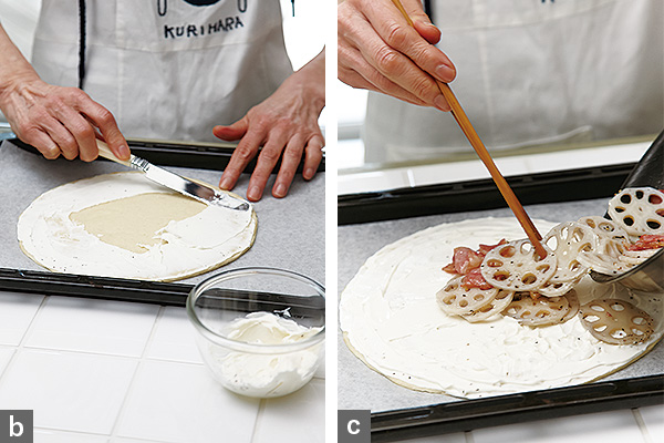- 5. 天板にピザ生地1枚をのせ、(4)を全体に塗る(写真b)。