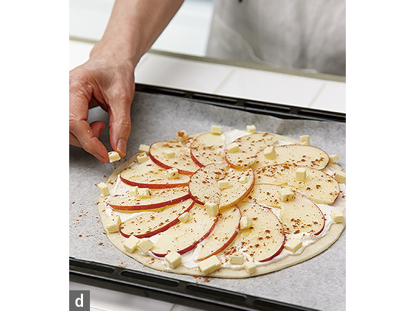- 9. 天板にピザ生地1枚をのせ、生地の縁を1cmほど残して(8)を全体に塗る。りんごをのせ、グラニュー糖大さじ1とシナモンパウダーをふる。香ばしく焼き上がるようにバターは縁に多くのせる(写真d)。