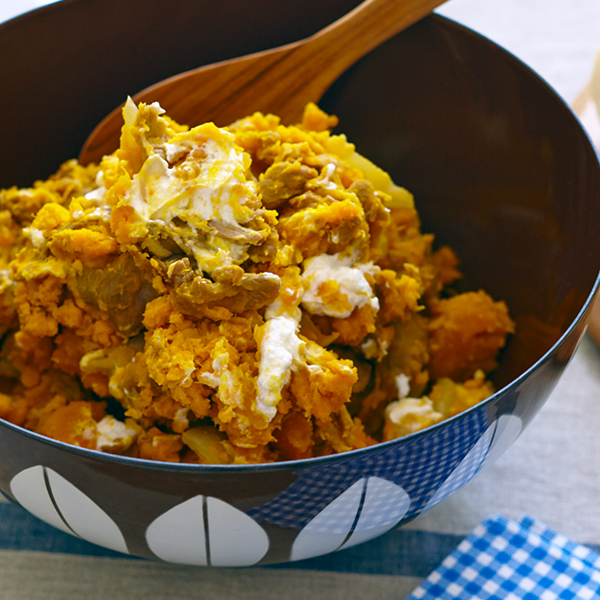 玉ねぎは煮上がりに加えて余熱でちょっとだけしんなりさせて。仕上げに水切りヨーグルトをさっと混ぜることでおいしさが何層にも重なったかぼちゃのサラダが楽しめます。私はこれを焼きたてのパンにはさんで食べるのが大好き。