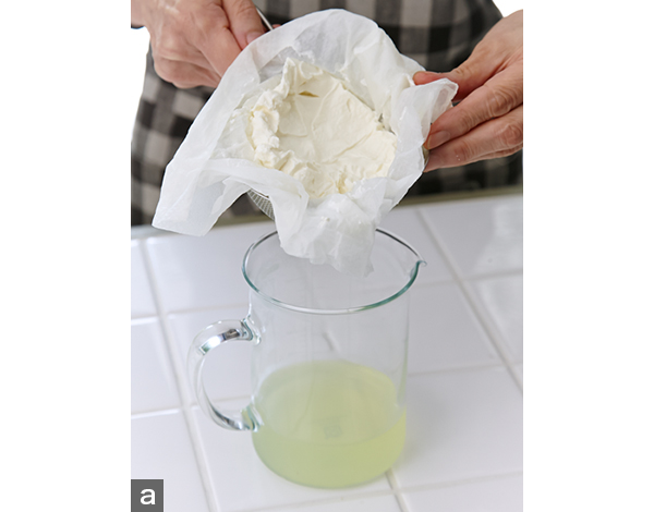 - 1. ボウルなどにざるを重ねてペーパータオルを敷き、ヨーグルトをあける。ラップをして冷蔵庫に入れ、1時間以上おく(写真a)