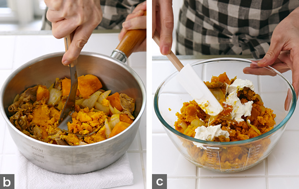 - 7. かぼちゃが熱いうちに好みの加減につぶし(写真b)、粗熱を取る。