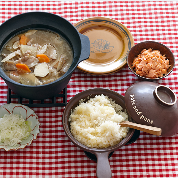 チーズごはんは、蒸らし前のごはんにゴーダやチェダーのクラッシュをのせるだけ。チーズがとろっとなじんだごはんに、うちの夫はほぐした焼き鮭をのせて食べるのが大好き。小鍋で炊いて食卓に並べると少人数でもごちそうに見えます。合わせる汁ものは季節の野菜ときのこの豚汁で、味つけはみそです。豚汁といっても主役は野菜。豚バラ肉は少しでよい味が出ます。多めに作って2回に分けても楽しめます。