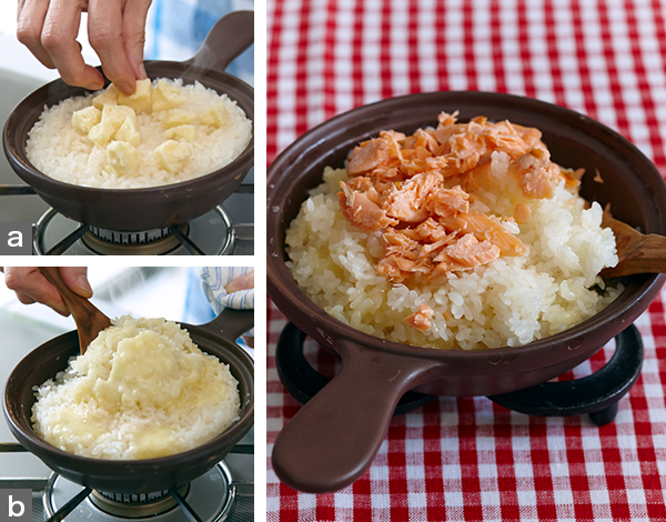 - 4. ごはんを蒸らし終えたら軽く混ぜ(写真b)、味をみて塩、こしょうで調える。器に盛り、食卓で鮭をのせていただく。