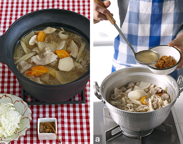 - 7. 野菜がやわらかくなったらまいたけを入れて火を通す。みそ大さじ5~6に煮汁を少し加えて溶いてから鍋に入れ(写真a)、ひと煮立ちしたら火を止める。