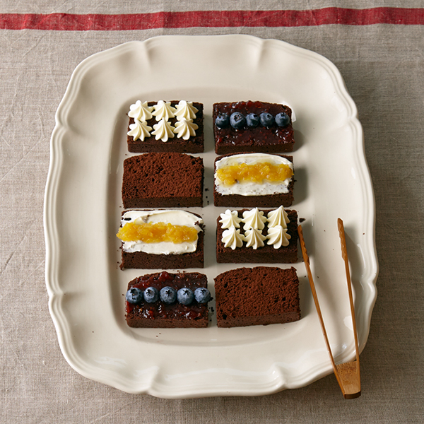 - 11. (9)のチョコレートケーキに(10)のクリームを絞ったり、クリームを塗った上にマーマレードをのせたり、ココアパウダーをふったり、ラズベリージャムを塗ってブルーベリーをのせたり、好みに仕上げていただく。