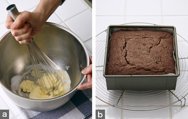 - 9. 網にのせ(写真b)、粗熱が取れたら型からはずして十分に冷まし、好みの厚さに切る。