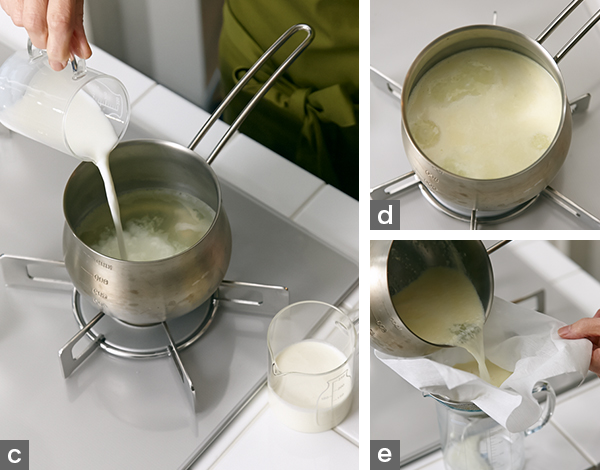 - 10. 自家製クロテッドクリームを作る。鍋にホエイを入れて中火にかけ、温まったら生クリーム、牛乳を加え(写真c)、弱火で静かに煮る。もろもろと分離してきたらさらに約3分煮る(写真d)。ペーパータオルを敷いたざるにあけてこす(写真e)。粗熱を取って冷蔵庫に入れ、水気がよく切れたらクリームをボウルに入れ、ミニ泡立て器でなめらかになるまで混ぜる。