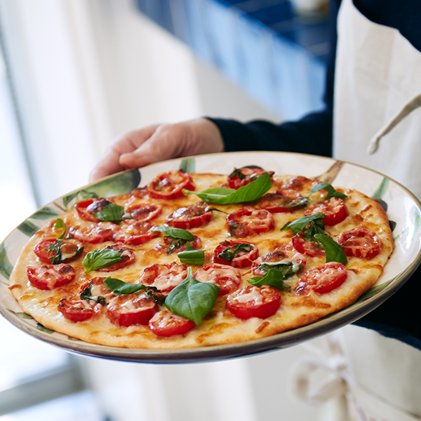- 3. 220℃のオーブンで約12分焼き、よい焼き色がついたら取り出す。残りのバジルをちらし、熱いうちに切り分ける。