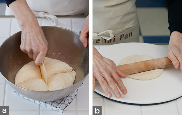 - 8. 生地に打ち粉をふり、めん棒で薄く丸くのばす(写真b)。