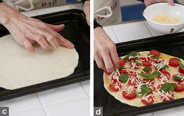 - 2. (10)の生地にオリーブ油大さじ2を塗り、トマトをのせる。バジルは少し残してちぎってのせ、チーズをちらす(写真d)。