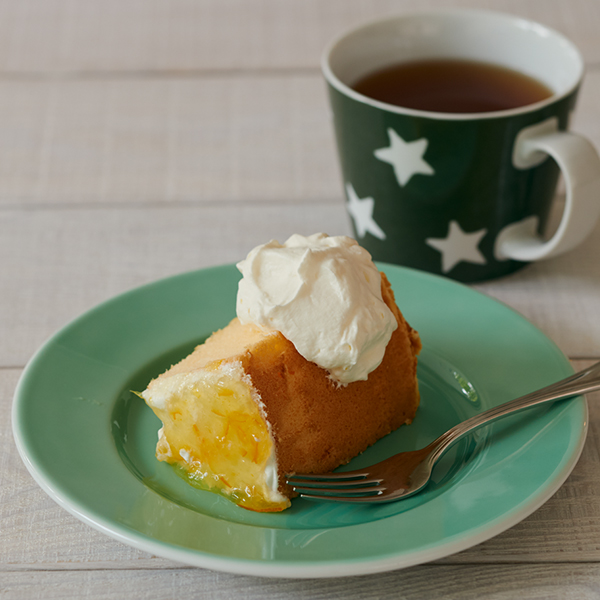 シフォンケーキはチーズケーキと並んで、長年うちで人気のおやつです。どちらも40年近く前から作り続けていて、いつ食べても飽きないやさしい味がします。今回ご紹介するシフォンケーキは卵3個で作れる小さいサイズです。生地にオレンジジュースを加え、デコレーションはホイップクリームとマーマレード。ふわふわの食感となめらかなクリーム、かんきつの香りであっさりといただけます。
