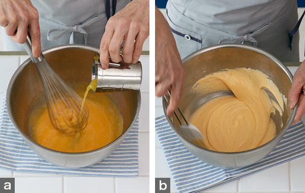 - 5. (3)に(4)のメレンゲの1/3量を加えて手早くよく混ぜる(写真b)。残りを2回に分けて加え、白いところがなくなるまで泡が消えないように手早く混ぜる。