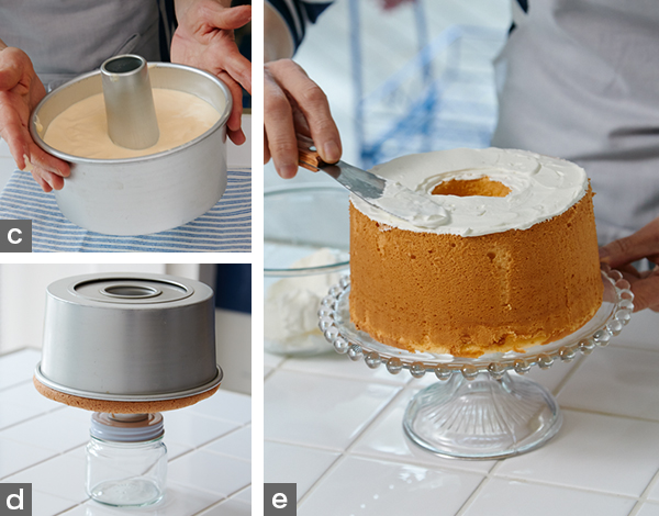 - 7. 焼き上がったら逆さにして型の中央を空きビンなどで支え、蒸気を逃がして十分冷ます(写真d)。冷めたら型の周囲と中央にナイフを入れて生地をていねいにはずし、底も同様にはずす。