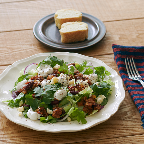 うちのチリコンカンは、スパイスを効かせた深みのある味です。自家製サワークリームのほうは水切りヨーグルトと生クリームで気楽に作っていますが、チリコンカンにさわやかなコクを加えるひとさじです。ふんわり盛ったレタスやハーブの上にチリコンカン、サワークリーム、「クラッシュ」のチーズ! このサラダ仕立てのワンプレートは自分で言うのもなんですが、気に入った盛りつけができました。