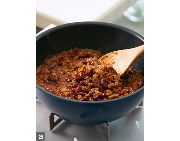 - 6. ときどき混ぜながら中火で10~15分煮てなじんだらトマトケチャップ、Aの香辛料を加えて塩、こしょうで味を調える(写真a)。