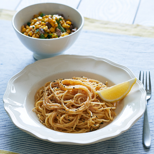 明太子のクリームパスタは夏にうれしい手軽なレシピです。うちではほぐした明太子に生クリームと卵黄を加えて、ちょっとカルボナーラ風に作ります。仕上げは味を引き締める黒こしょうとレモン。おまけのもう一品はコーンのミント炒めです。うちの夫はコーンのバター炒めが大好きなので、今回は豚肉でボリュームを加えます。ミントのさわやかな香りで食欲も湧きます。