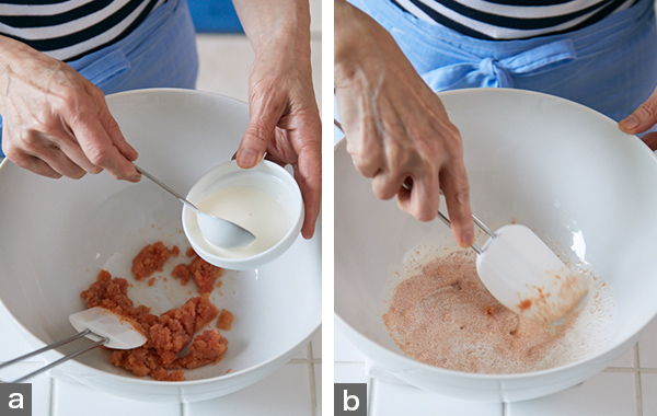 - 1. 明太子は薄皮から出して大きいボウルに入れ、生クリームを加え(写真a)、よく混ぜ合わせる(写真b)。