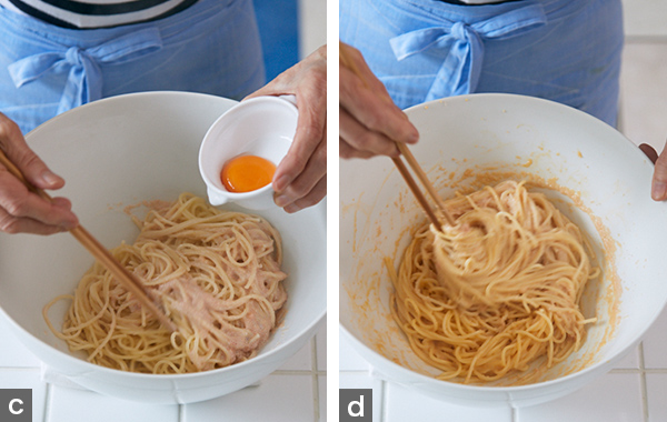 - 3. スパゲッティがゆで上がったらざるに上げ、水気をよく切って①のボウルに入れ、熱いうちに手早くあえ、卵黄も加えて混ぜてなじませ(写真c・d)、こしょうをふる。