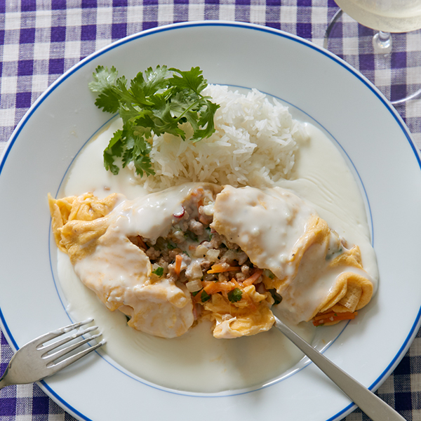 オムレツの中身はナンプラーや香菜の香り立つ、ひき肉と野菜炒めです。そこに軽く仕上げたホワイトソースをかけ、タイ米ごはんを添えました。こんなワンプレートごはんが私は大好き。エスニック味にクリーミーなソースの組み合わせを、ココナッツミルクではなく、牛乳で作るホワイトソースにしたところが身近で新鮮です。ぜひタイ米ごはんに混ぜながら食べてみてください。