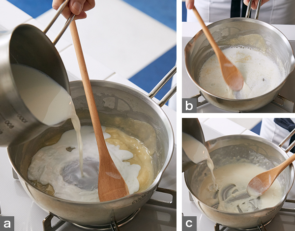 - 1. ホワイトソースを作る。フライパンにバターを熱し、薄力粉をふり入れて焦がさないように弱火で1~2分炒める。温めた牛乳を少しずつ加えて混ぜ、なじませる(写真a・b)。これを数回繰り返す(写真c)。残りの牛乳を加えてなめらかに混ぜながら2~3分煮て、塩、こしょうで味を調える。