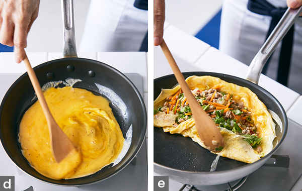 - 4. オムレツを焼く。ボウルに1人分卵2個をよく溶きほぐし、軽く塩、こしょうをする。フライパンにサラダ油大さじ1 1/2を熱し、卵液を流し入れて大きく混ぜる(写真d)。半熟状になったら(3)の半量を入れ、手早くオムレツ型にまとめる(写真e)。