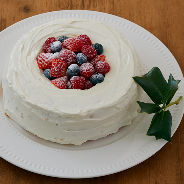バターのいい香りがするケーキを丸いリング型で焼き上げました。まわりのデコレーションは真っ白なマスカルポーネクリーム。なめらかでコクがある、とてもおいしいクリームです。真ん中のくぼみにベリーを彩りよくのせれば、クリスマスのリングケーキのでき上がり。アレンジは同じ生地をマフィン型で焼き、クリームやベリー、ジャムで飾るミニケーキ。次はどちらを作ろうかと迷うのも楽しみです。