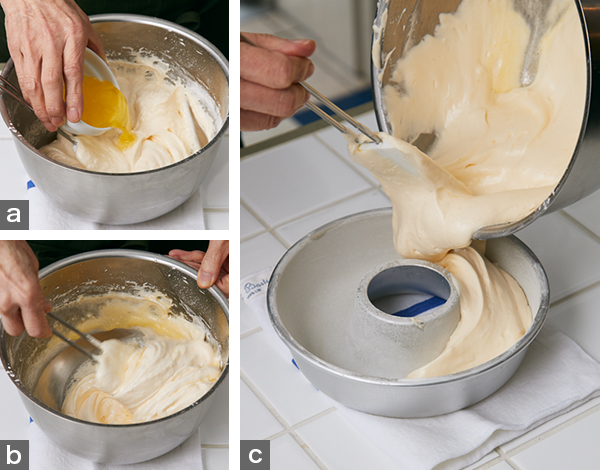 - 4. (3)を型に流し入れ(写真c)、170℃のオーブンで約25分焼く。