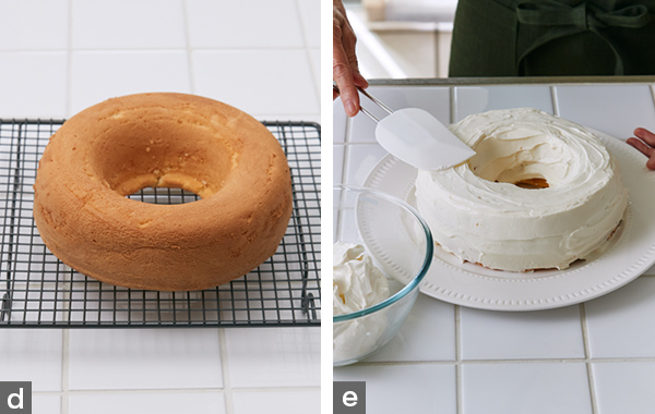 - 7. (5)のリングケーキを器にのせ、マスカルポーネクリームを塗る(写真e)。中心に好みのベリーを盛って粉糖をふり、あればひいらぎなどを添える。