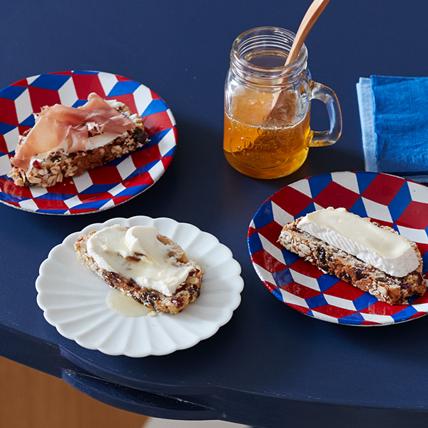 パンの切り口からこぼれるくらい、たっぷりのドライフルーツとくるみを入れました。オートミールは生地だけでなく表面にもまぶすので香ばしく焼き上がって食べごたえも十分です。薄めに切ったらクリームチーズやカマンベールチーズをのせ、はちみつをかける食べ方が私のおすすめ。ちょっと大人っぽいおやつになります。生ハムをのせればワインのつまみにもなり、残ったパンは冷凍保存もできます。