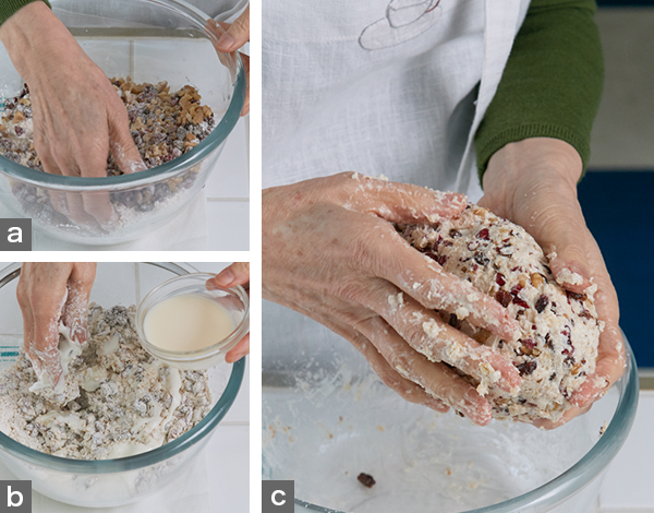 - 5. さらにサラダ油を加えて混ぜたら手でまとめる(写真c)。