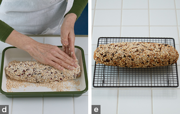 - 6. 長さ約25㎝、幅約8㎝の大きさに押さえながら形を整え、表面にオートミールをまぶす(写真d)。
