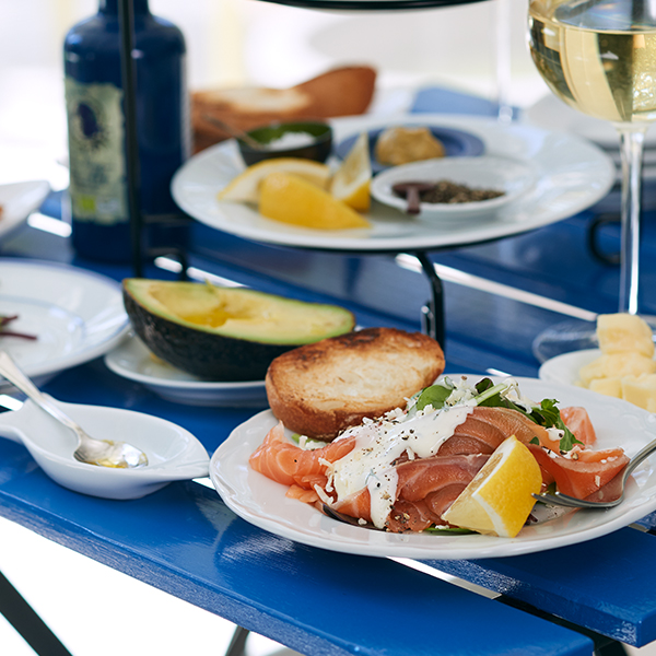 - 8. サーモンマリネと付け合わせを取り分け、ディルクリームチーズソースをかける。好みでオリーブオイルといっしょにすくったアボカド、塩、こしょう、マスタード、レモンを絞りかけていただく。