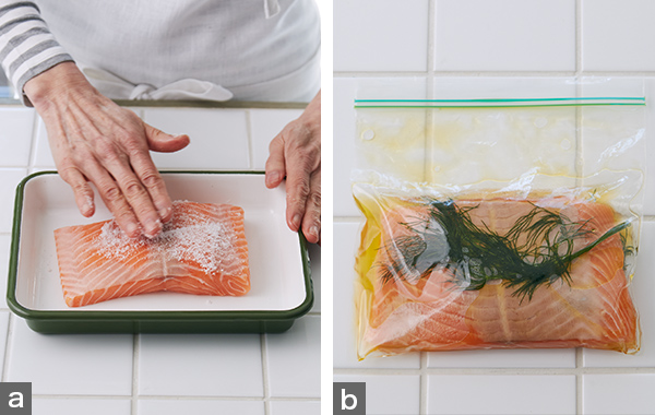 - 2. (1)の鮭を取り出して表面の水気と塩気を拭き取り、別の保存袋に入れる。オリーブ油をかけ、ディル5~6本をのせ、冷蔵庫でさらに2~3時間以上おく(写真b)。