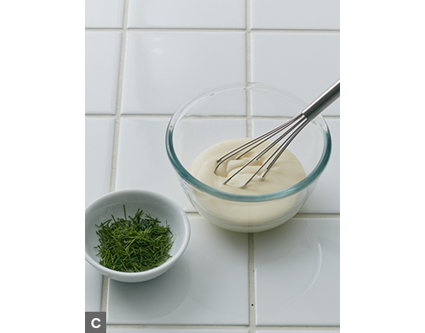- 5. ディルクリームチーズソースを作る。万能クリームチーズは上記の要領で作り、 ディルを刻んで加え、塩、こしょうで味を調える(写真c)。