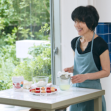 今まで水切りヨーグルトになじみのなかった人は、一度作ってみるとその手軽さに驚くはず。水切りしたプレーンヨーグルトはおだやかな酸味のある、濃厚なクリームのようです。私はこの味が大好きで、料理やお菓子作りに長年重宝しています。今回は酢じょうゆ卵とトマトの前菜をおいしく飾ったり、ふだんは甘辛だれが多い焼きとりもさわやかなディップにしたり。おなじみの料理が楽しくなります。