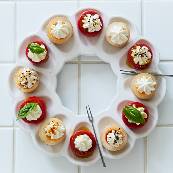 酢じょうゆ卵はひと晩おけば味がよくしみて、冷蔵庫で1~2日は日持ちしますから、私はいつもまとめて作っています。サラダにのせたり、サンドイッチにはさんだり、カレーの薬味にも重宝。ここではトマトと盛り合わせて前菜に仕上げますが、水切りヨーグルトがさわやかな味のアクセントになっています。絞り出せば見た目もおしゃれです。好みでオリーブ油やこしょう、バジルなどを添えて。