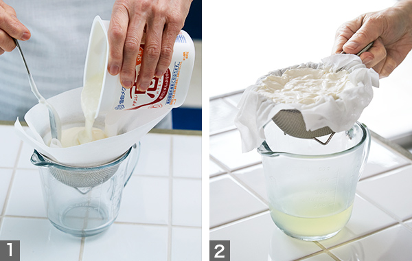 - 1. ボウルや容器にざるを重ねてペーパータオルを敷き、プレーンヨーグルトを入れる。
