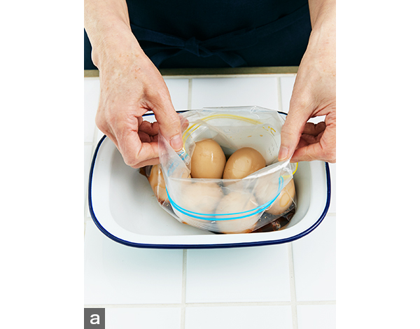 - 2. 酢じょうゆ卵を作る。卵は鍋に入れ、かぶるまで水を入れて火にかけ、水から12分ゆでる。途中で煮立ったら弱火にする。冷水に取って殻をむき、水気を拭く。ポリ袋などにしょうゆ、酢、砂糖を入れて混ぜ合わせ、ゆで卵を漬ける。空気を抜いて口を閉じ、冷蔵庫で2~3時間おく(写真a)。※ひと晩漬けると味がよくしみる。