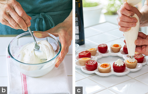- 4. 酢じょうゆ卵は横半分に切る。トマトはヘタを取って横半分に切り、軽く塩をふる。器に盛り合わせて(3)の水切りヨーグルトを絞り出す(写真c)。卵には粗びきこしょうや七味をふり、トマトにはオリーブ油をかけ、バジルを添える。
