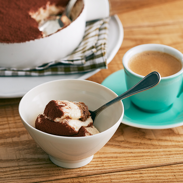 ティラミスの主役になるマスカルポーネクリームは、砂糖を加えた卵黄にマスカルポーネ、ホイップクリーム、メレンゲを順番に混ぜるだけ。これほどなめらかで口溶けのよいクリームが食後に出てきたら「ああ、今日のごはんもおいしかった」と思ってもらえるはずです。急ぐときはこのクリームをグラスに盛って「雪印北海道100 マスカルポーネ」添付のエスプレッソソースをかけるだけでもおしゃれなデザートになります。