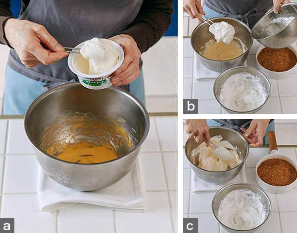 - 7. (6)に(5)のメレンゲを1/3量ほど入れて混ぜてから(写真c)、残りのメレンゲを加えて泡をつぶさないよう軽く合わせる。